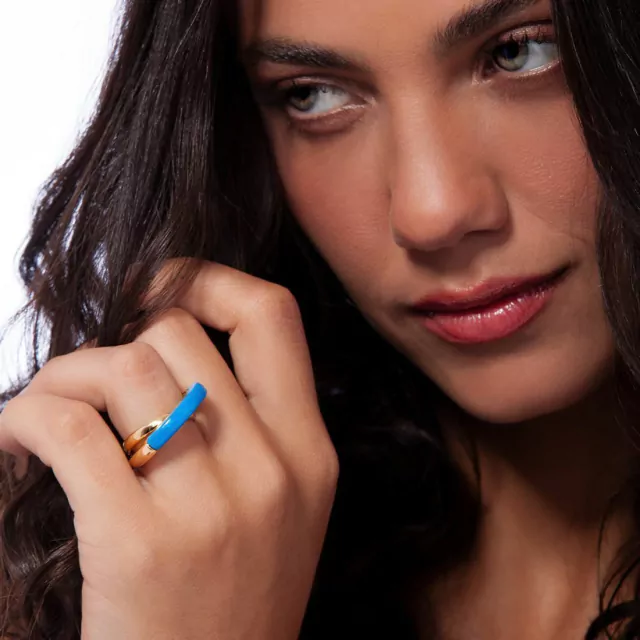 O grande destaque é a Haulita Turquesa, lapidada em uma forma exclusiva orgânica, com design tubular, que desafia os limites da joalheria. Essa técnica especial é um diferencial da Maria Dolores, já que exige precisão e resulta em uma beleza única. A pedra, combinada ao dourado do aro, cria uma paleta vibrante e chique que combina com tudo, do styling casual a produções elegantes.