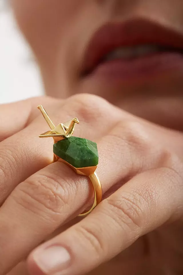 O Anel Tsuru Maria Dolores combina delicadeza e significado em uma peça de acabamento refinado. O aro fino destaca a presença do tsuru, a icônica ave sagrada do origami japonês, pousado sobre a pedra natural Jaspe Verde facetada. Com formas precisas e esculturais, o tsuru simboliza longevidade e bons desejos, unindo tradição ao design contemporâneo da marca. Leve e confortável, é um anel delicado folheado a Ouro. Versátil para o dia a dia, funciona tanto como peça única quanto em composições mais expressivas. Uma joia com detalhes marcantes, pensada para quem valoriza propósito, design e sofisticação em cada escolha.