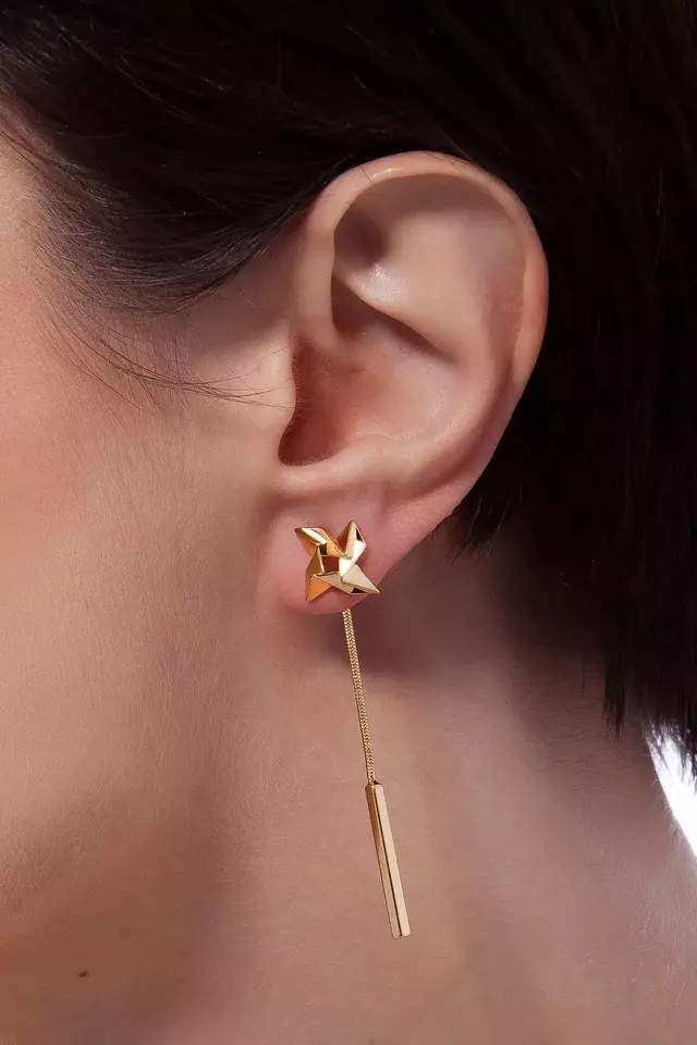 Delicado e multifuncional, o Brinco Kaze P Maria Dolores traz o charme do cata-vento em uma versão delicada e cheia de possibilidades. O brinco longo, folheado a Ouro, trabalha o design com superfícies facetadas e angulações que remetem ao origami. O destaque fica por conta do pendente removível, formado por uma corrente em malha rabo de rato fina com ponteira de metal, que permite criar diferentes formas de uso: curto, longo ou assimétrico, com um lado com a corrente e outro sem. Um brinco 2 em 1, versátil e expressivo, ideal para quem gosta de brincar com o styling e compor com leveza e personalidade outras peças da linha Kaze.