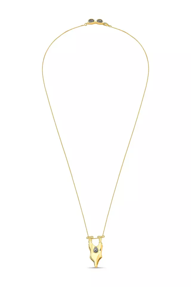 O Colar Verão Maria Dolores une alegria e sofisticação em peça folheada a ouro com malha veneziana, pingentes de óculos e mini maiô com pedras Drusa Metalizada, trazendo frescor e personalidade com elegância da coleção Dolce Tropicália.