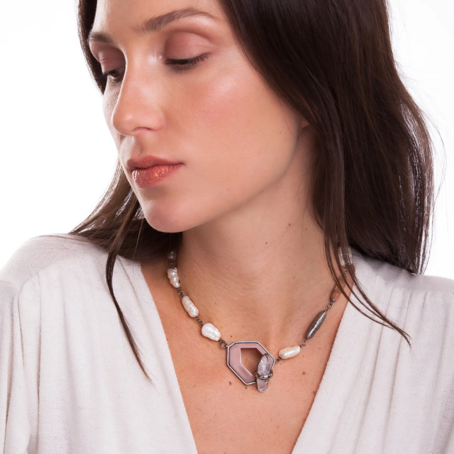 Colar Fusão - Madeira Rosa, Cristal, Pérola Barroca e Drusa Metalizada - Coleção Existe Em Mim